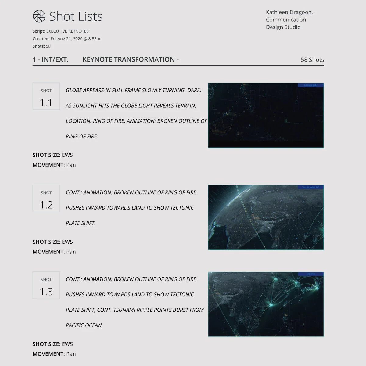 Communication Design begins with putting pen to paper and having a conversation. I work with executive teams and individuals to build scripts and storyboards. Using tools like Studio Binder and skeleton decks in Keynote help map out how the story can be told in a way that speaks to the audience.